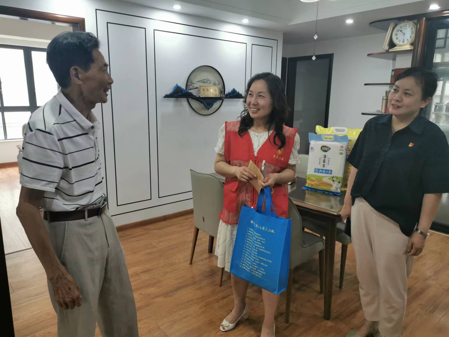 在天逸華庭小區(qū),志愿者們看望55年黨齡的老黨員甘黃興,關切地詢問他的家庭狀況、日常生活,表達對他多年發(fā)揮黨員先鋒模范作用、敬業(yè)奉獻的敬意,鼓勵他繼續(xù)弘揚光榮傳統,發(fā)揚優(yōu)良作風,關心和支持社區(qū)工作。