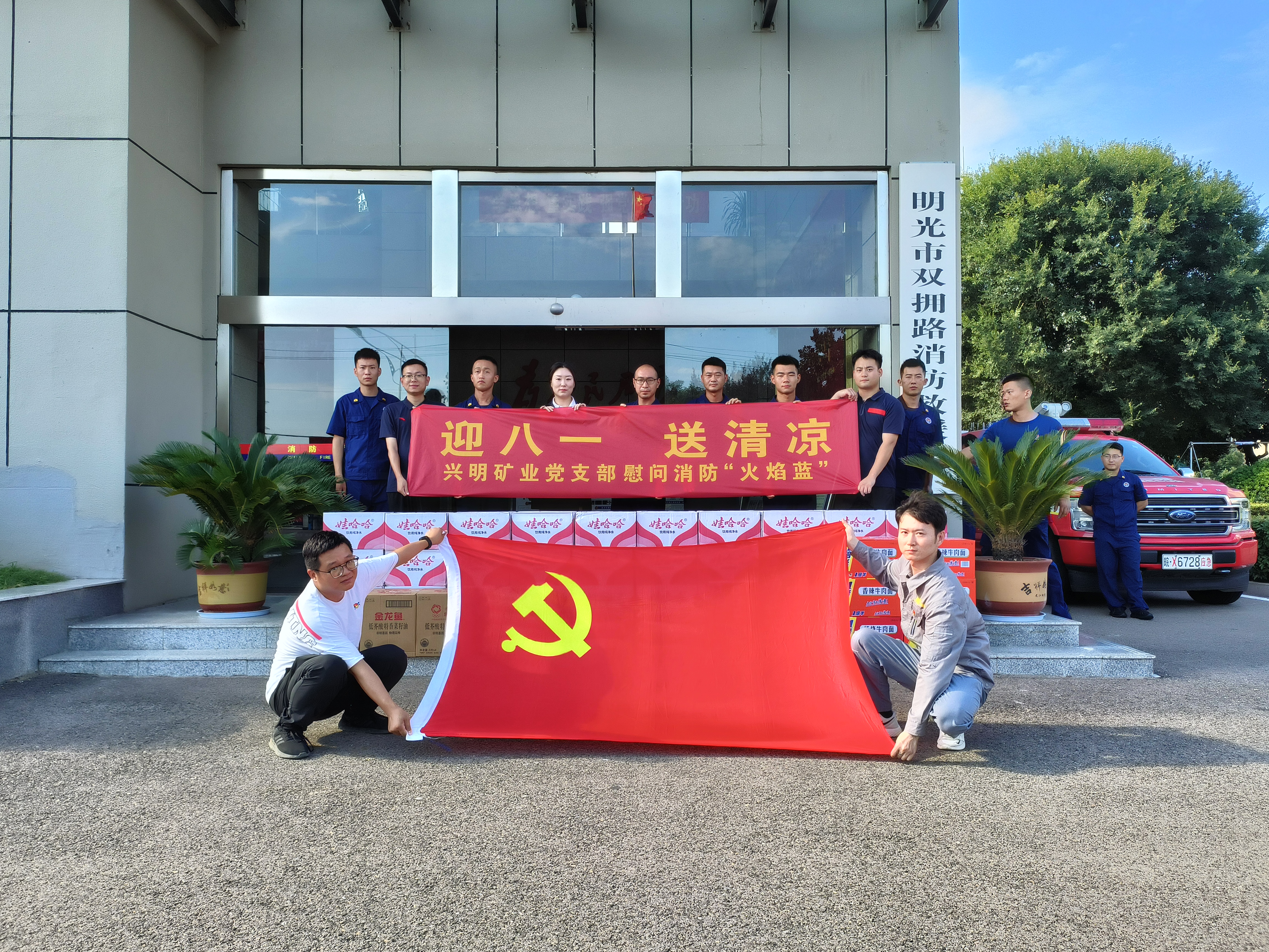 “八一”前夕,興明礦業(yè)黨支部帶著滿滿的關(guān)懷與敬意,走進明光市消防救援大隊開展“送清涼”活動,為消防員們送上了礦泉水、方便面等物資。
