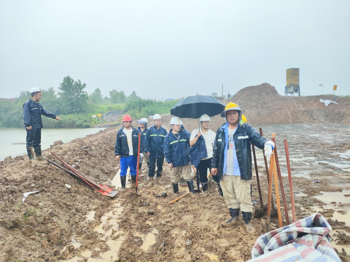 連日強(qiáng)降雨導(dǎo)致諭興礦界外河流水位暴漲,隨時可能漫進(jìn)礦坑,并淹沒兩側(cè)農(nóng)田。興天礦業(yè)立即啟動應(yīng)急預(yù)案,動員公司全體黨員干部職工、工程公司及實(shí)業(yè)公司項(xiàng)目部工作人員、運(yùn)輸隊(duì)司機(jī)等約30余名人員組成搶險突擊隊(duì),調(diào)集挖機(jī)、渣土車用土石方對上游決口位置進(jìn)行封堵。與此同時,突擊隊(duì)員肩扛沙袋、雨布等物資奔赴現(xiàn)場,爭分奪秒展開搶險工作。